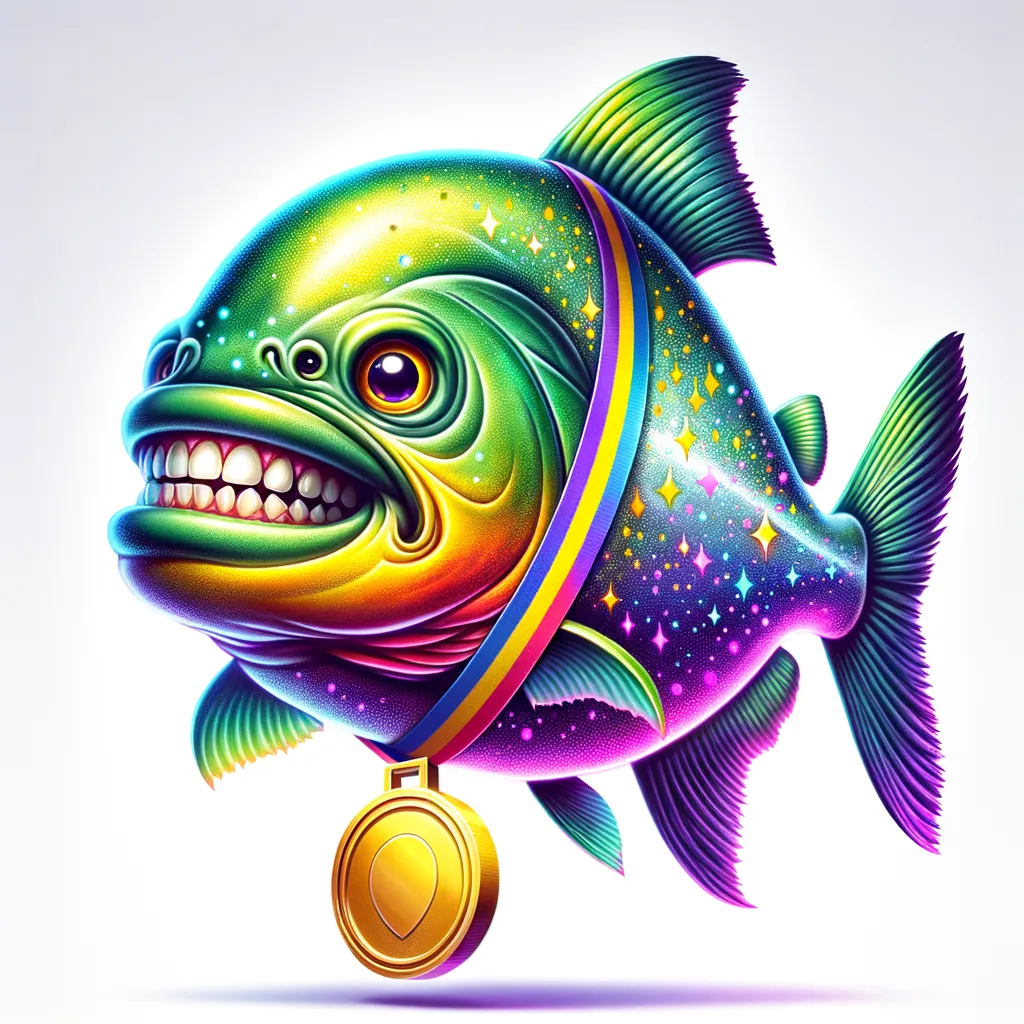 Purple neon green piranha with no teeth. He is wearing a gold medal because he just won