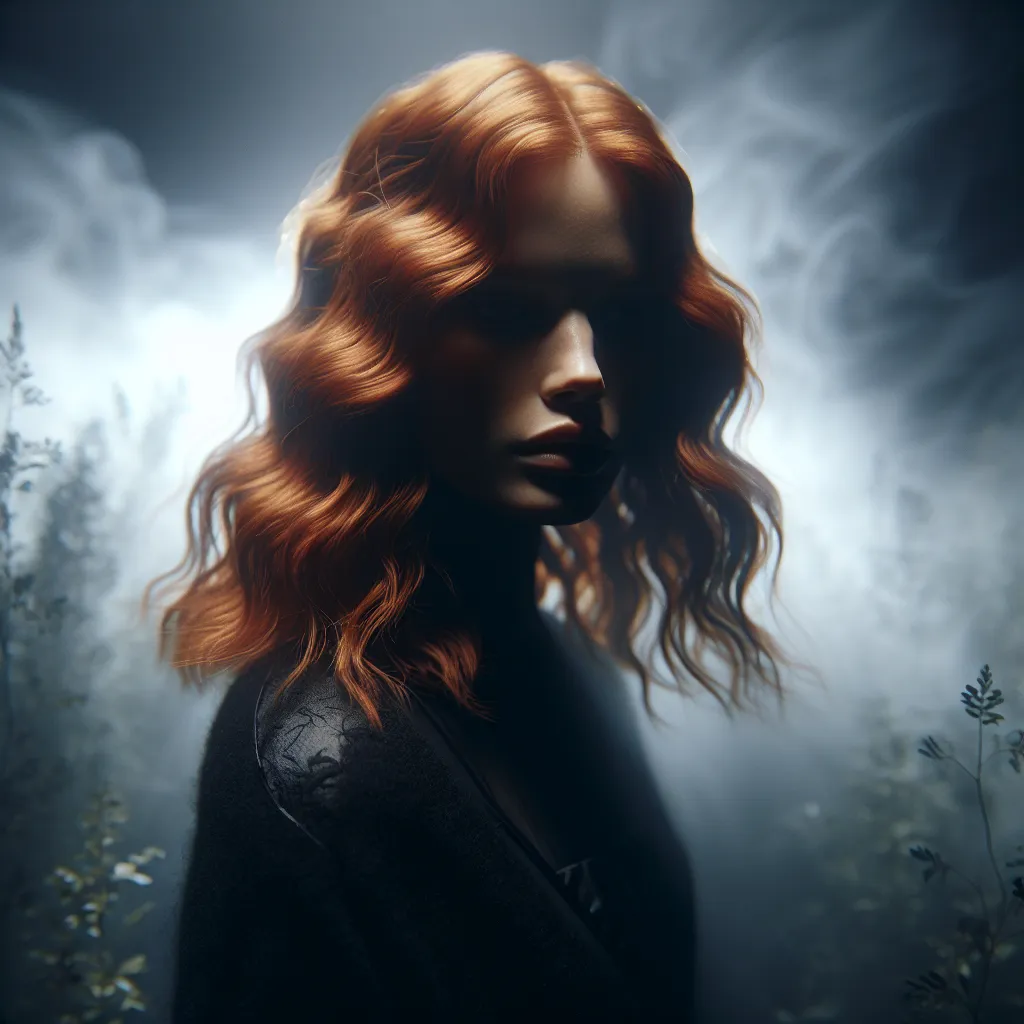 Create a series of photorealistic images featuring a woman with ginger hair and pale skin, wearing an all-black outfit against the backdrop of a dense foggy night, capturing the mysterious and ethereal ambiance. Head to toe image
