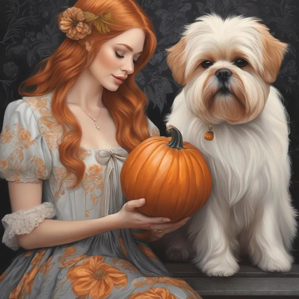 Ginger haire, fair skinned woman with a pumpkin and a Shih tzu