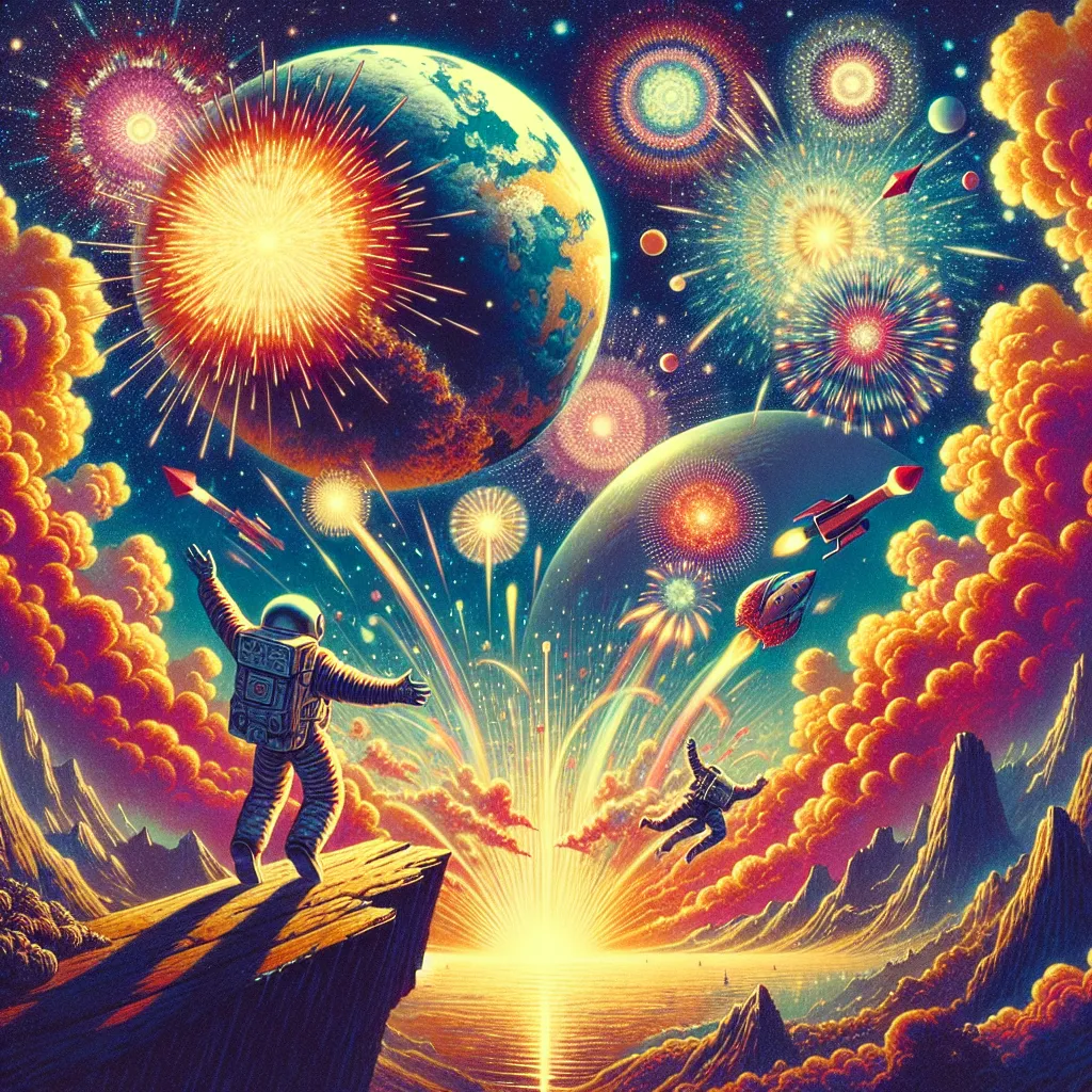 An imaginative depiction of Earth viewed as a fragment of debris following an explosion in an expansive alternate universe that closely resembles our own, capturing the moment of the Big Bang that set the cosmos in motion.