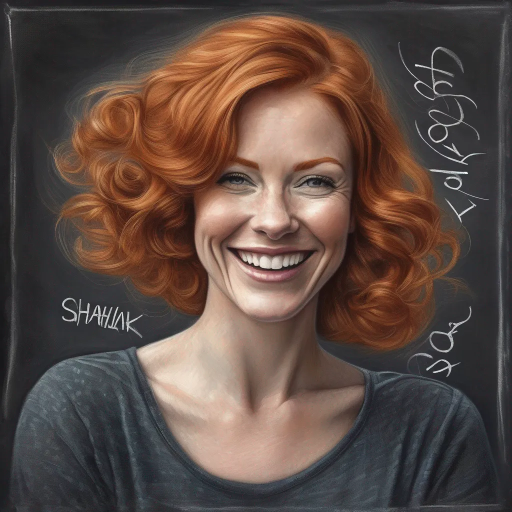 Photorealistic image. Chalk drawing . Ginger haired woman. Word ‘ Shakalaka’ visible . Funny