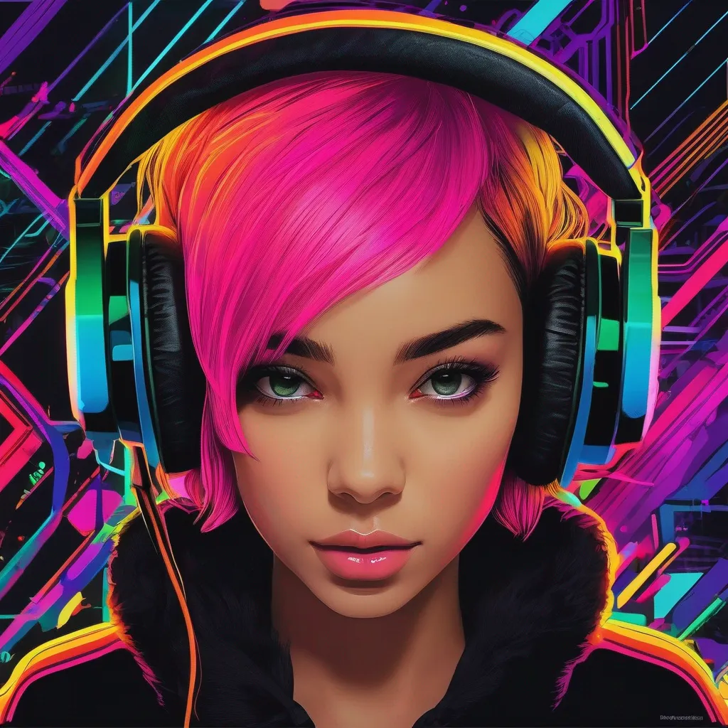 A black background with a girl with short hair wearing headphones with a neon outlines of different colors around