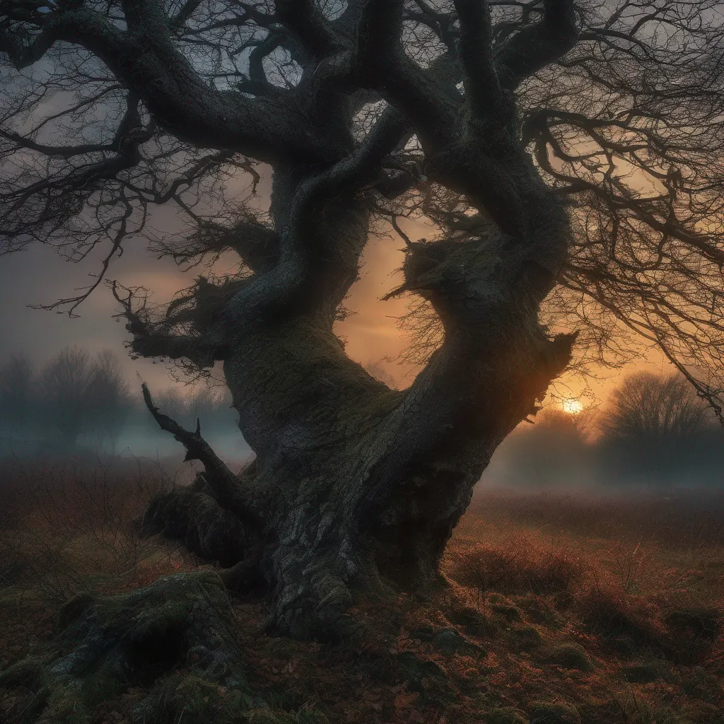 "At the edge of the village lies Blackthorn Forest, a place shrouded in perpetual twilight and whispered legends of doom. The trees within are wickedly twisted and ancient, their bark gnarled and blackened as if scorched by dark magic. Their branches, like clawed fingers, stretch out menacingly, and their roots writhe just beneath the surface, eager to ensnare unwary travelers. The air is thick with a musty decay, and an eerie silence blankets the forest, broken only by the occasional, unsettling groan of wood twisting in the absence of wind. The forest floor is littered with bones, evidence of those who entered seeking fortune or glory and found only despair. The trees themselves seem alive, their hollow knots resembling eyes that watch intently, while faint, mocking laughter echoes among the branches. At night, ghostly faces materialize in the bark, whispering curses and luring the lost further into their leafy entrapment. Despite its sinister reputation, the heart of Blackthorn Forest beckons those bold or desperate enough to seek the rumored artifact said to be hidden within—a source of immense, but cursed, power. Yet, the forest guards its secrets jealously, and those who dare the journey may find the greatest threat is the forest itself, where the trees conspire to ensure no soul ever leaves."