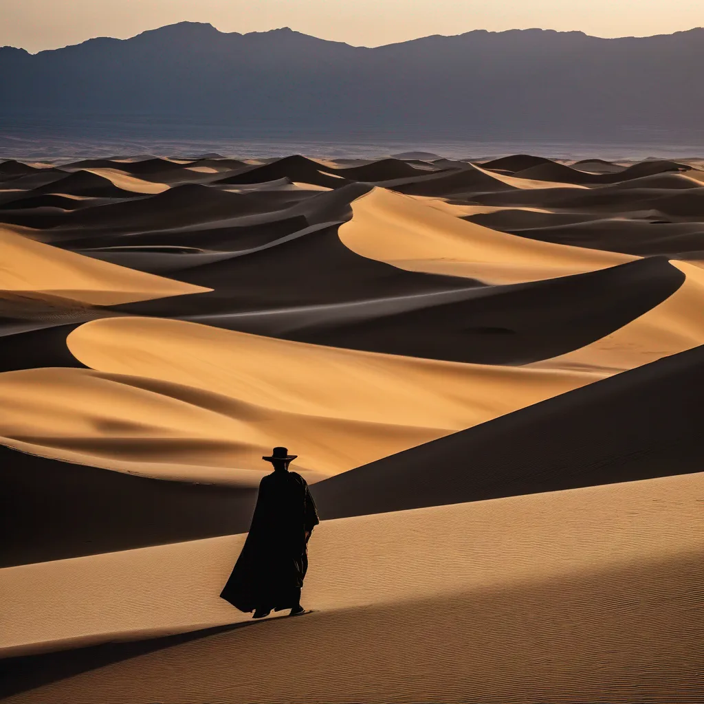 Create an evocative desert scene where the sun casts long, dramatic shadows across the dunes. In the distance, a shimmering mirage blurs the horizon, distorting the landscape in a mesmerizing dance of heat and light. In the foreground, the silhouette of a lone traveler stands atop a dune, their outline stark and mysterious against the sunlit sand. Capture the ethereal interplay of shadows and light, emphasizing the surreal and dreamlike atmosphere of the desert mirage, with the figure’s silhouette adding a touch of intrigue and isolation. This prompt uses shadows, mirage, and silhouette to build a vivid, atmospheric image.