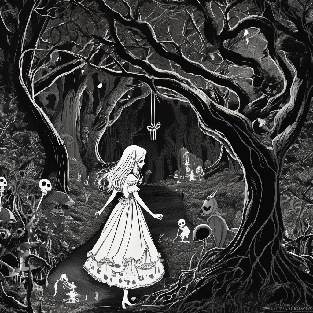 Under the pitch-black night sky, Alice in Wonderland stands alone in a dark, twisted forest, her shadow unnervingly alive. The shadow jack skeleton nightmare before Xmas stretches from her feet, morphing into skeletal shapes and ghostly figures as if revealing the gateway to hell itself. Her expressionless face reflects the horror unfolding beneath her, making it seem like this nightmarish vision is part of her mind. Behind her, an old mansion looms, adorned with Halloween decorations, glowing pumpkin lanterns scattered around, and bats flying overhead. A faint, flickering light leaks from the mansion’s cracked windows, barely piercing the darkness.