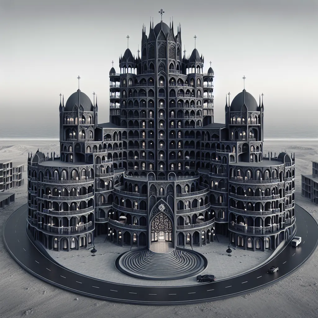 Creates 3D Image with dark, moody aesthetics, incorporating architectural elements from the Gothic era