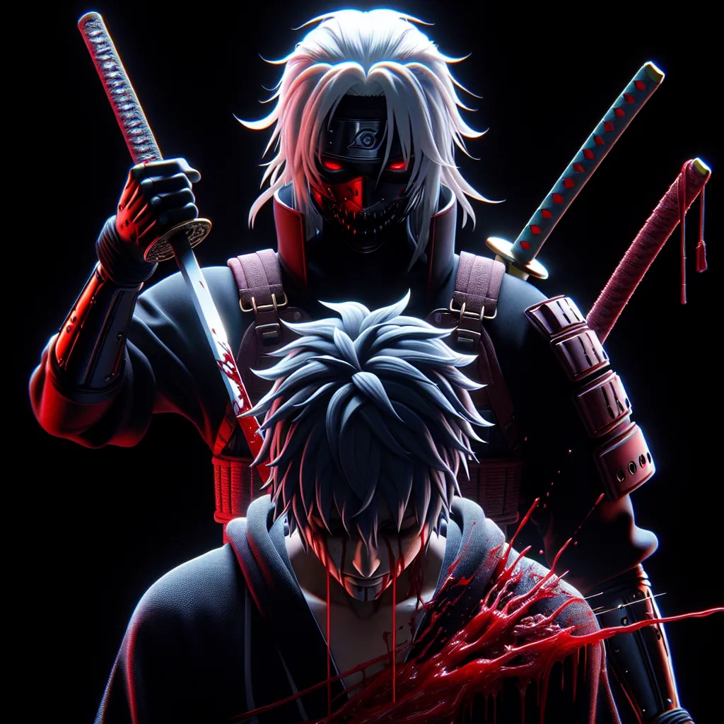 The sinister ninja stands over their fallen enemy, blood dripping from their katana held downwards. As they gaze upon the lifeless body, a shadowy figure emerges from the darkness behind them, ready to strike. Time is running out for the ninja to defend themselves against this unseen threat. How will they escape this deadly situation?