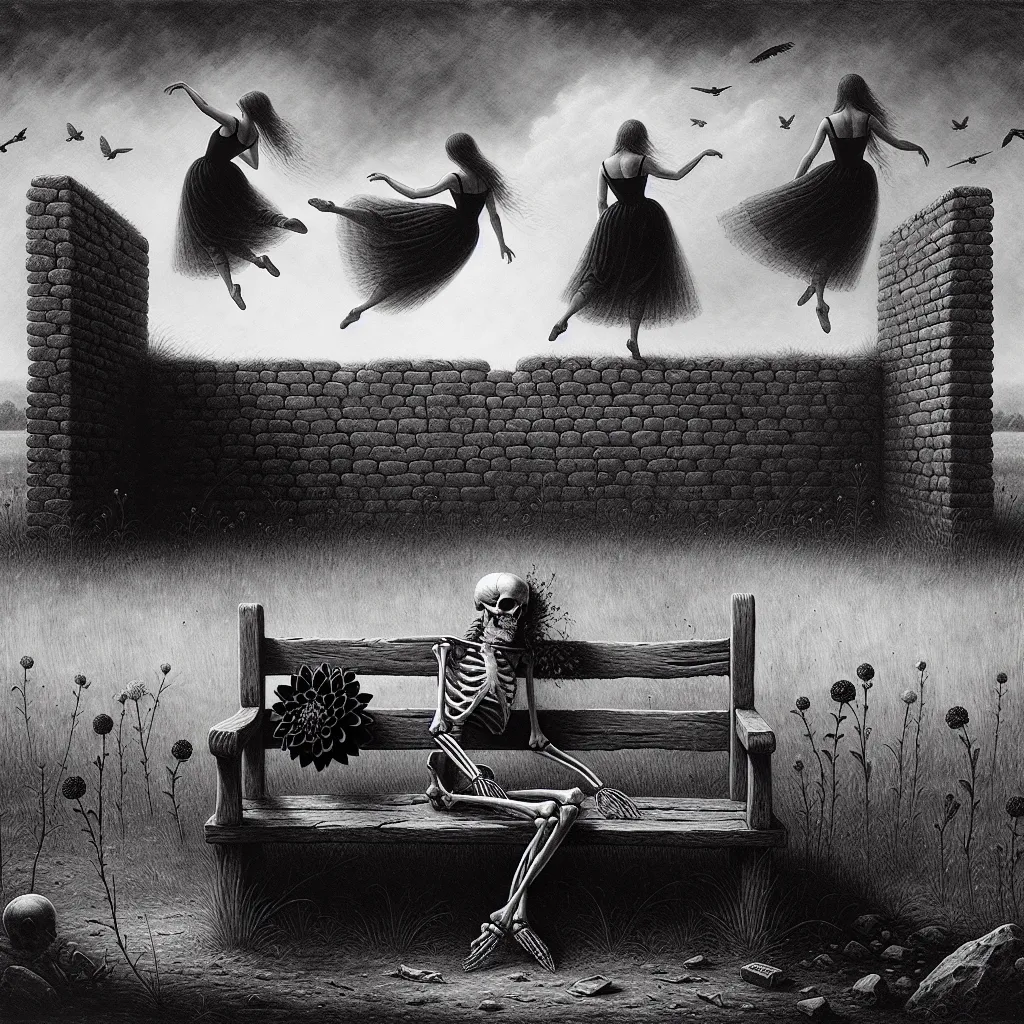 Generate a monochrome image of a desolate, grassy field enclosed by a low brick wall. In the foreground, a solitary eroding bench rests against the wall, with a skeleton seated on it, its skull replaced by a black dahlia flower. The overcast sky looms heavy above, inhabited by ethereal figures in black ballerina dresses that appear to float or soar, exuding an aura of eerie despair and seeking an escape.
