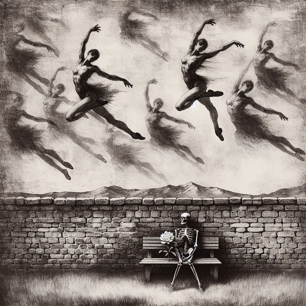 Skeleton with large peony for head. Generate a monochrome image of a desolate, grassy field enclosed by a low brick wall. In the foreground, a solitary eroding bench rests against the wall, with a skeleton seated on it, its skull replaced by a black dahlia flower. The overcast sky looms heavy above, inhabited by ethereal figures in black ballerina dresses that appear to float or soar horizontally , exuding an aura of eerie despair and seeking an escape.