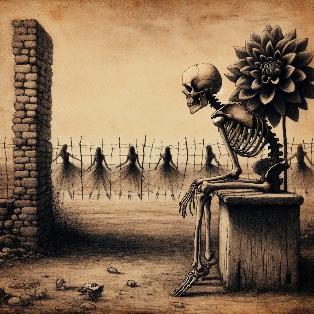 A melancholic scene featuring a skeleton seated on an old, eroded bench, its head replaced by an oversized black dahlia. In the background, a worn brick fence borders a vast field. Ethereal black figures donned in elongated ballet dresses float horizontally above, conveying a sense of desperate search for an escape, adding an eerie and sorrowful atmosphere to the tableau.