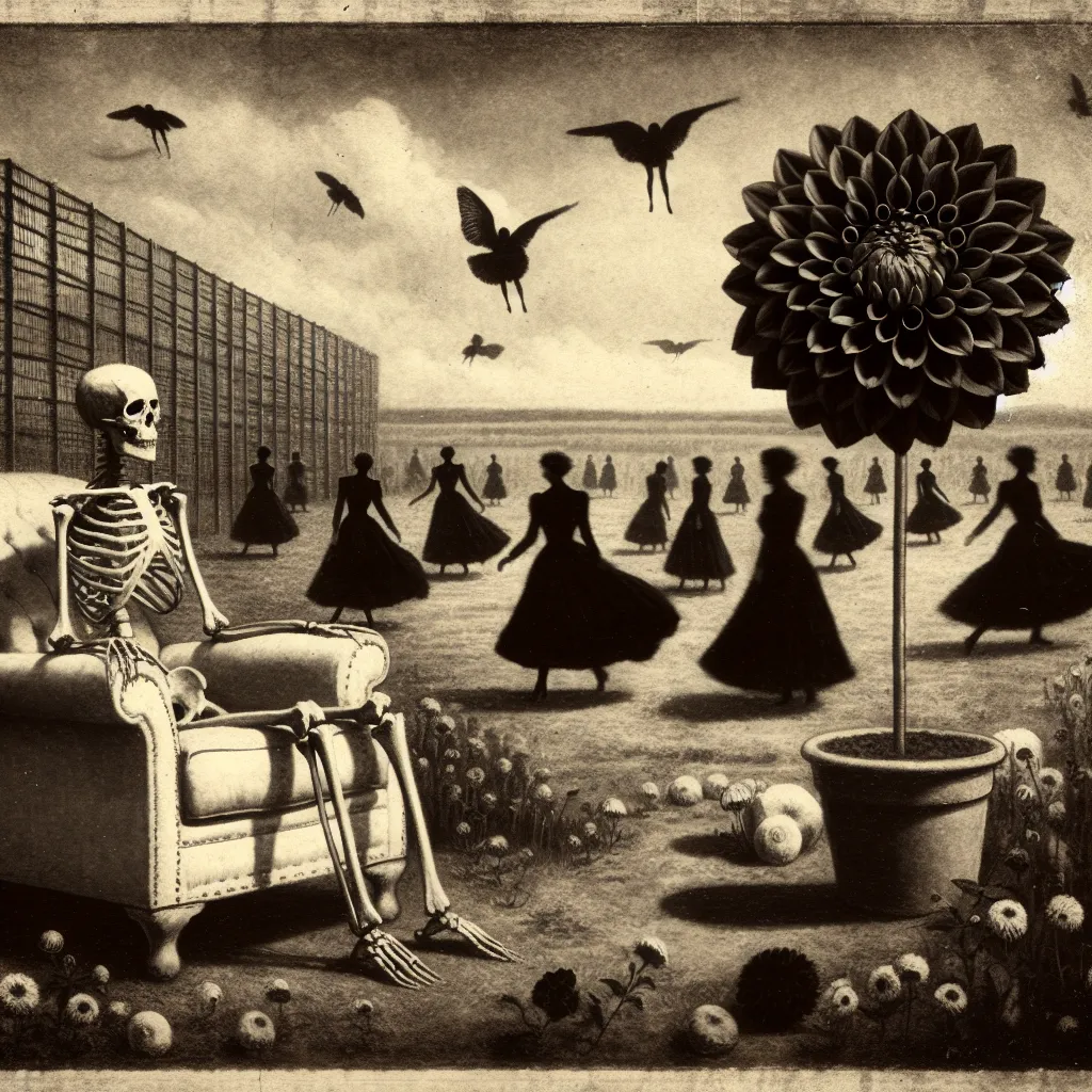 A skeleton with a large black dahlia for a head is sitting on an old thick white armchair . Behind the bench is a brick fence, with a field behind it. Floating in the air ethereally, in a horizontal position are black figures in black dress with short crinoline skirts searching for escape as they fly through the air breaking through the brick fence.The scene is melancholy, scary, sad