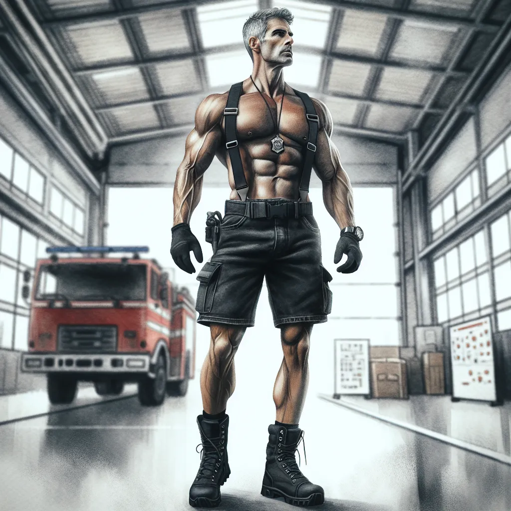 A muscular, gray-haired Caucasian firefighter with a serious, determined expression poses heroically in an industrial corridor of a fire station. The shallow depth of field focuses on him, blurring the background, with uniform lighting emphasizing his bodybuilder physique. He's dressed in black laced up shorts, dark gray tactical gloves with reinforced knuckles, and black tactical boots with ankle straps. He also wears a red helmet with a badge and a pendant necklace that adds a personal touch to his look, suggesting a fitness or promotional photoshoot.
