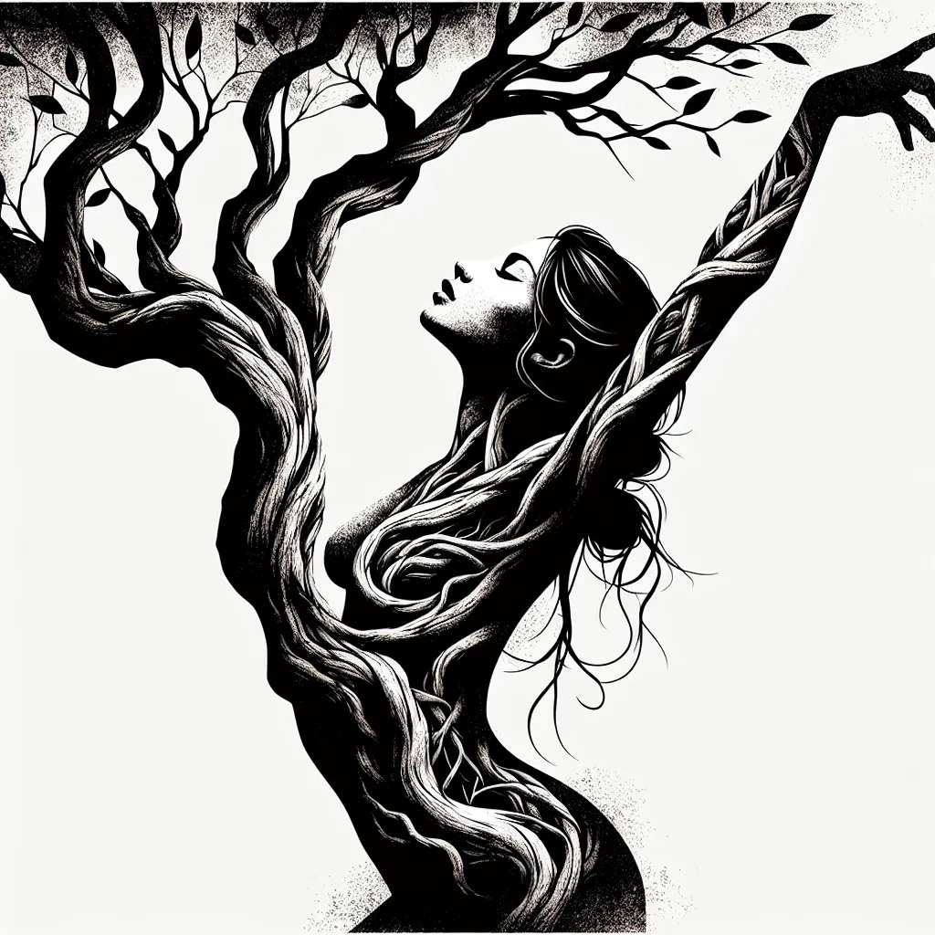 Create a black and white vector silhouette depicting a side profile of a sensual woman with her arms outstretched above her head. Her body should seamlessly morph into twisting tree branches, creating an organic fusion that forms her figure in a minimalist style, with no background.