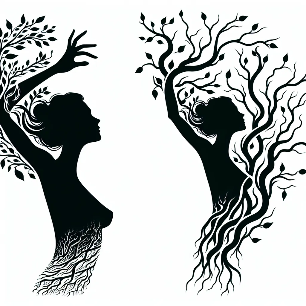 Create a black and white vector silhouette depicting a side profile of a sensual woman with her arms outstretched above her head. Her body should seamlessly morph into twisting tree branches, creating an organic fusion that forms her figure in a minimalist style, with no background --displaced bodyparts,