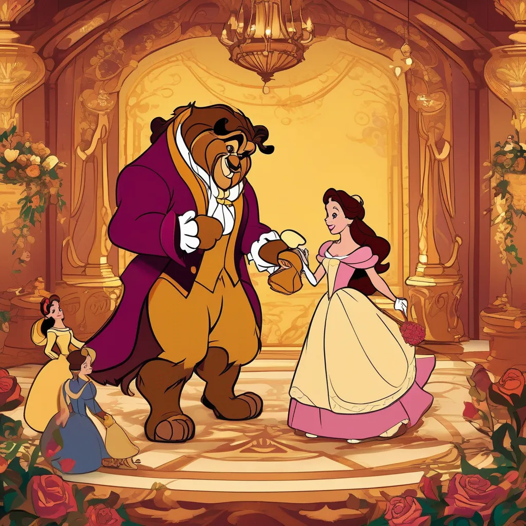 Create an image in the style of Disney, depicting characters from "Beauty and the Beast," such as Belle, Beast, and Lumiere, engaged a game of tug of war. The setting should blend the iconic charm of the Disney movie with the intense atmosphere of the Squid Game challenge, ensuring that the characters retain their unique, animated appearance while adapting to the Squid Game's theme.