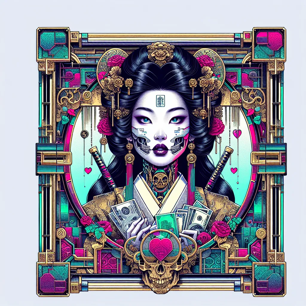 Shaped Logo brand name [Dead Hearts & Butterflies] Anime logo Extremeley detailed masterful linework Inclde a gorgeous female with death and skull features, holding money and hearts Best details Better work Color pop [Fit image in space alotted do not go off of frame]