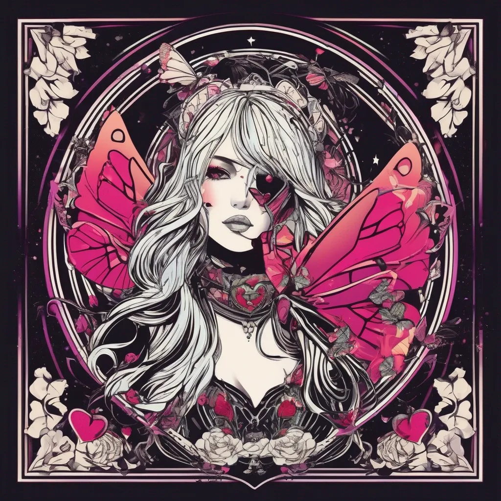 Shaped Logo brand name [Dead Hearts & Butterflies] Anime logo Extremeley detailed masterful linework Inclde a gorgeous female with death and skull features, holding money and hearts Best details Better work Color pop [Fit image in space alotted do not go off of frame]