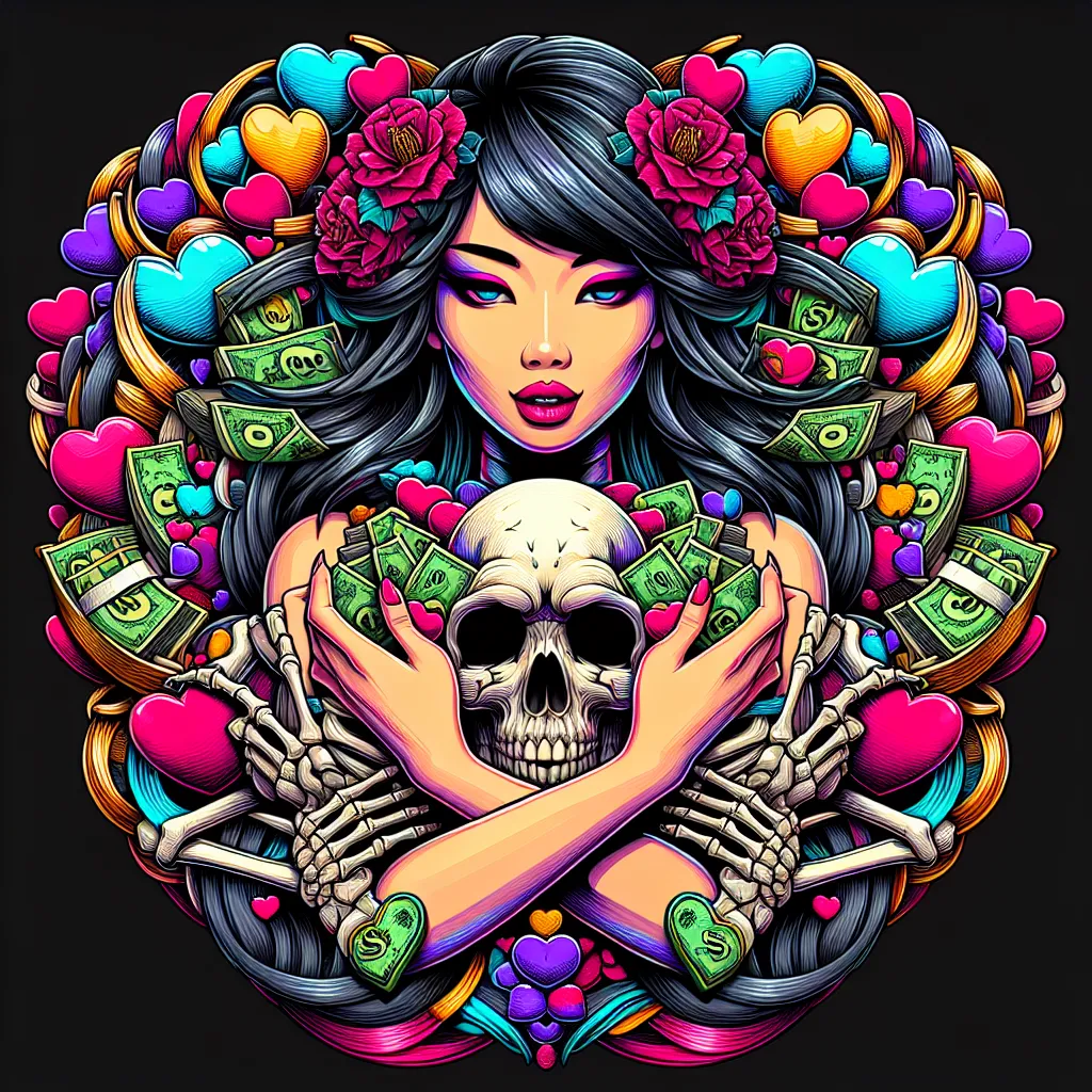 Shaped Logo brand name [Dead Hearts & Butterflies] Anime logo Extremeley detailed masterful linework Inclde a gorgeous female with death and skull features, holding money and hearts Best details Better work Color pop [Fit image in space alotted do not go off of frame]