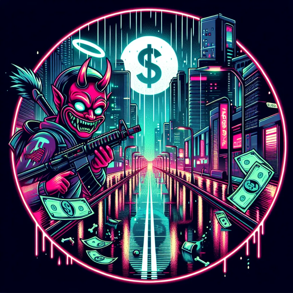 Design a cartoon-style circular logo featuring a cheeky demon wearing a dripping graffiti-style smiley face mask with prominent devil horns and wings. The demon should be wielding an AK-47 in one hand and gripping a sack overflowing with cash, with bills scattering around. Incorporate a stylized dollar sign motif and scattered bones to complete the composition. (More drip, and money] color pop, neon outline of logo