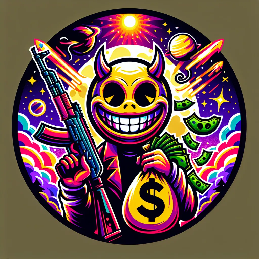 Design a cartoon-style circular logo featuring a cheeky demon wearing a dripping graffiti-style smiley face mask with prominent devil horns and wings. The demon should be wielding an AK-47 in one hand and gripping a sack overflowing with cash, with bills scattering around. Incorporate a stylized dollar sign motif and scattered bones to complete the composition. (More drip, and money] color pop, neon outline of logo