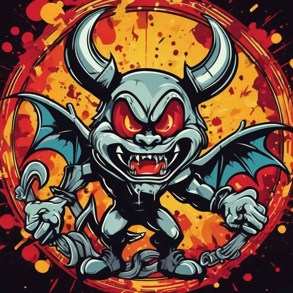 Design a cartoon-style circular logo featuring a cheeky demon wearing a dripping graffiti-style smiley face mask with prominent devil horns and wings. The demon should be wielding an AK-47 in one hand and gripping a sack overflowing with cash, with bills scattering around. Incorporate a stylized dollar sign motif and scattered bones to complete the composition. (More drip, and money] color pop, neon outline of logo