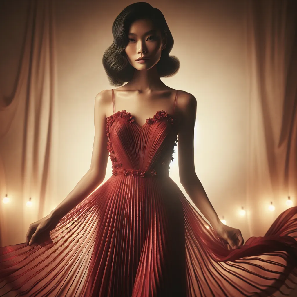 Create a stunning image of a woman wearing a flowing red dress, standing confidently in a softly lit scene. The dress should have delicate folds and intricate details, with lighting that highlights its rich color and texture.