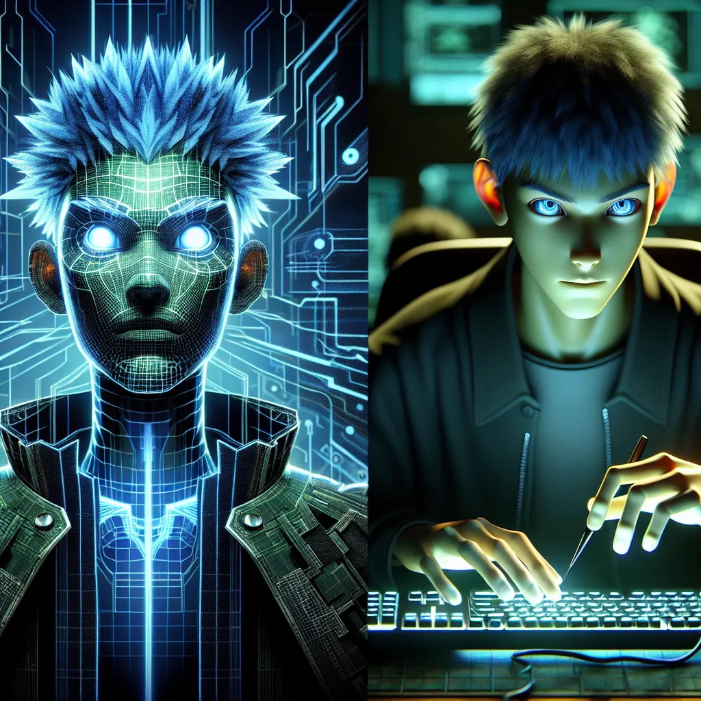 A mysteriously glowing, sinister figure crouches over a computer, their face illuminated by the eerie, iridescent light of the screen. This haunting image is a digital illustration, created with exquisite attention to detail. The hacker's sharp features are bathed in an otherworldly blue-green hue, casting a chilling glow on their intent expression. Their hands move swiftly over the keyboard, fingers dancing with malevolent grace as they infiltrate classified systems. The image captures the essence of technological espionage, blending unease with fascination in a masterful display of artistry.