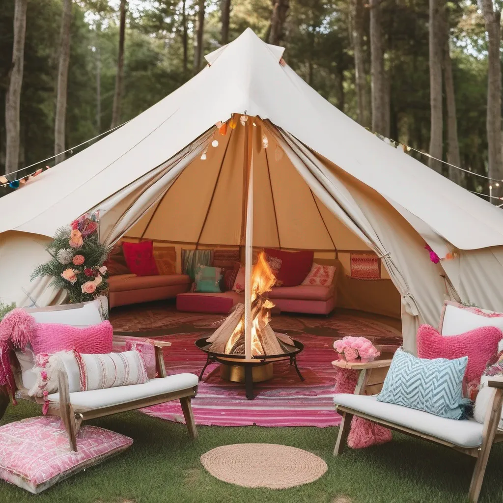 Organize a girls' glamping birthday sleepover party featuring a spacious bell tent adorned with a beach theme and festive birthday embellishments. Arrange the setting on a picturesque farm, complete with a cozy lounge area and a fire pit for evening relaxation.