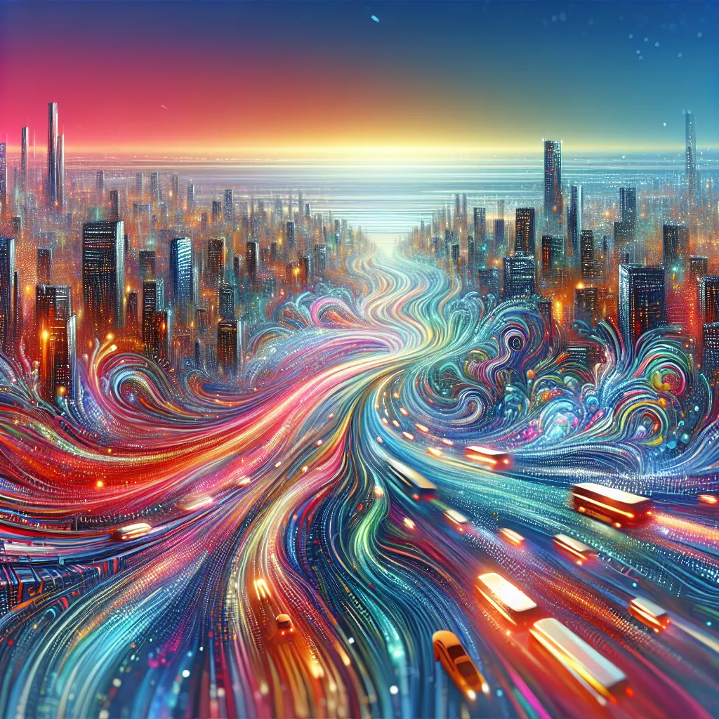 A futuristic cityscape viewed from a high vantage point, where the buildings seem to blend into flowing streams of light and color. The horizon is a blend of vivid gradients, and flying vehicles leave trails that resemble long-exposure photograph