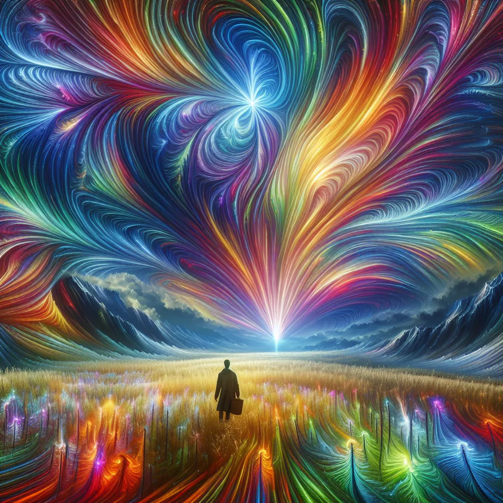 A lone figure standing in a field under a kaleidoscopic sky filled with swirling rainbow colors and radiant beams of light