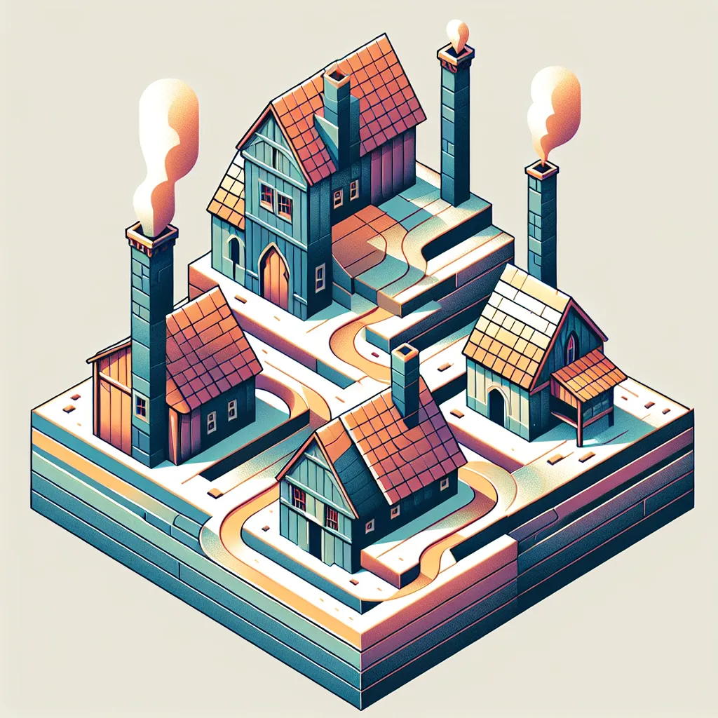 A cluster of three medieval homes with chimneys, smoke rising softly into the air, and a dirt path winding through them