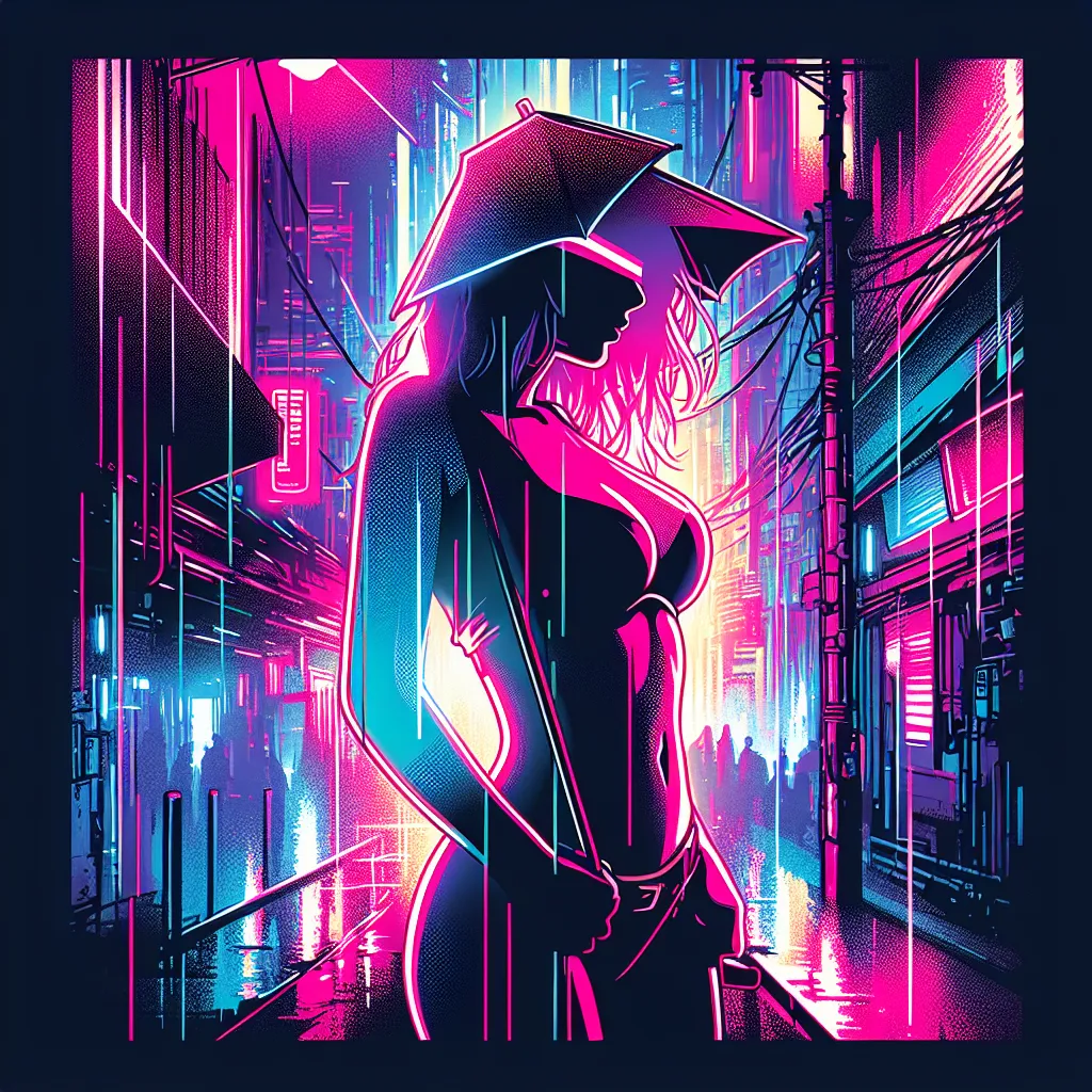 A beautiful woman standing under a neon sign, her silhouette softly lit by pink and blue hues.