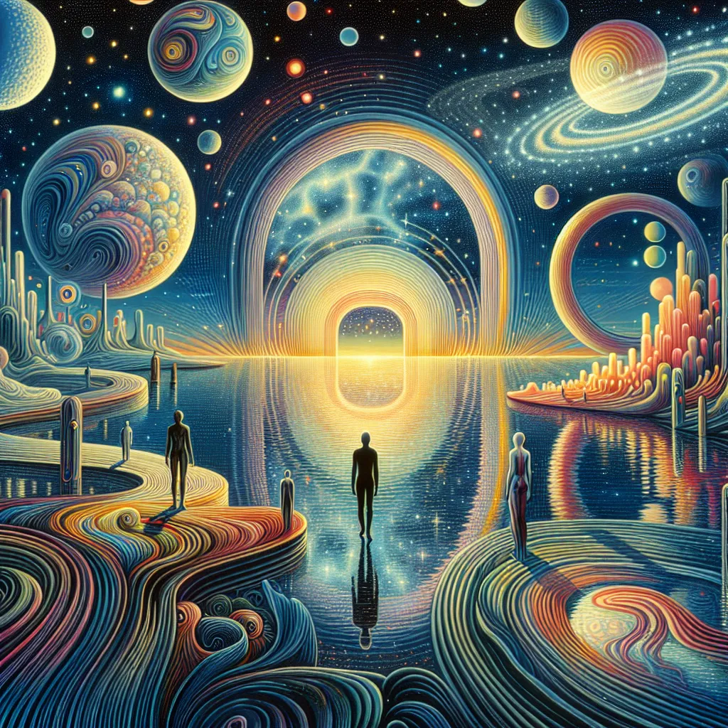 Takashi murakami studio ghibli style, An alien figure standing at the edge of a vast, mirrored lake, their reflection rippling into a kaleidoscope of shifting colors. Behind them, a horizon of stars bends into a glowing arc, creating a portal-like effect