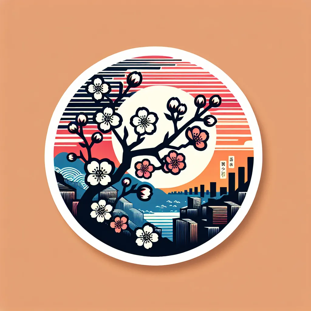 A single stylized cherry blossom branch, its petals drifting in the wind, framed against a gradient sky.