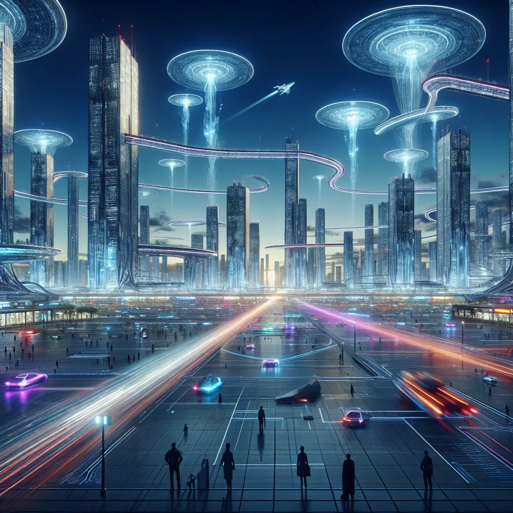 A sleek, glowing cityscape under a twilight sky, where transparent towers and floating platforms are linked by shimmering light bridges. Hovering vehicles zip between the structures, their trails leaving faint neon streaks in the air.