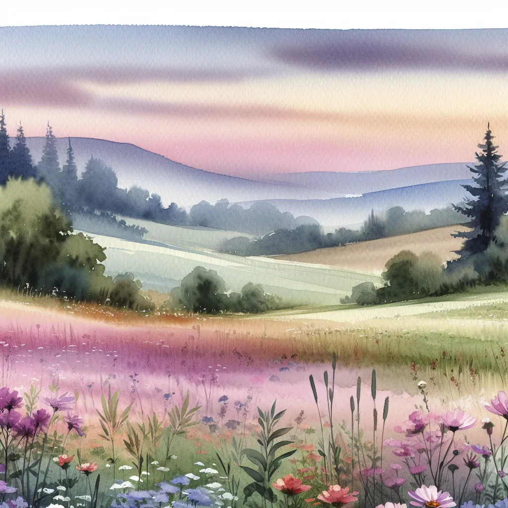 A serene meadow scene with rolling hills, blooming wildflowers, and a subtle sky gradient blending shades of pink, orange, and purple. The brushstrokes are soft, yet they provide enough detail to create depth and texture in the foliage and distant trees