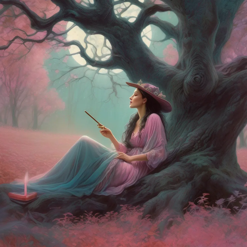 "In the heart of an enchanting forest glade, a mysterious sinister witch reclines against an ancient tree, drawing fragrant, swirling smoke from a herbal cigar. The night air is calm, and the moonlight casts a gentle crimson glow around her, illuminating her serene expression. Behind her, the backdrop features a stylized illustration of a five-lobed plant leaf, crafted with delicate artistry. The scene balances a sense of mystical tranquility with the natural beauty of her woodland sanctuary." Close-up shot