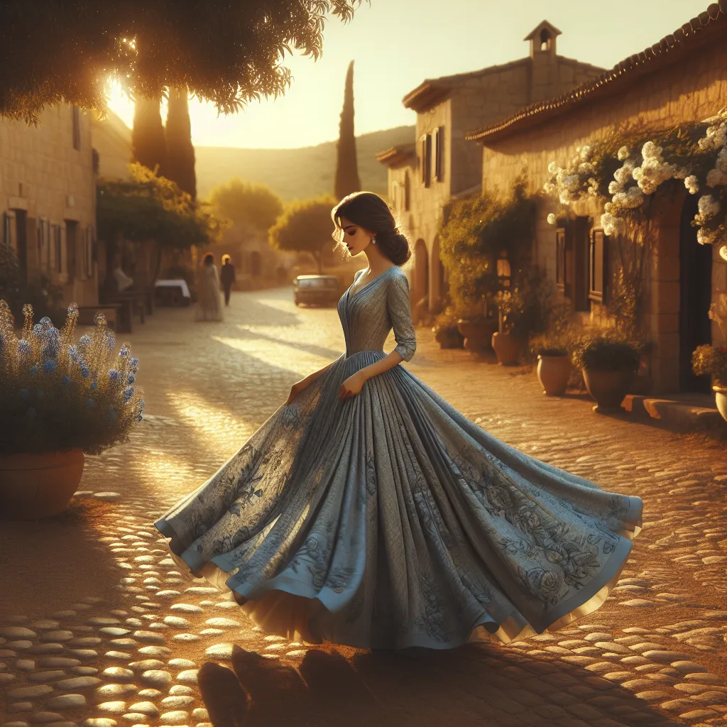 A young woman wearing a finely detailed blue dress, walking along a cobblestone path in a quiet village. Her dress flows gracefully as she moves, and the scene is illuminated by the golden hues of a setting sun, casting long shadows across the quaint, flower-filled square
