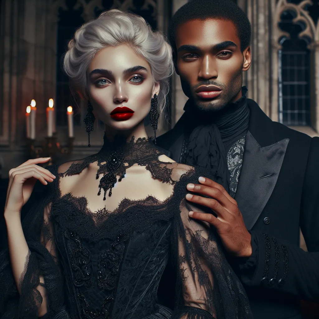 A mysterious couple poised before a massive, candlelit hearth in a grand manor. The woman’s gown flows around her feet as she gazes into the distance, her red lips contrasting with her dark attire. The man, dressed in a tailored black frock coat, rests one hand gently on her shoulder, his piercing eyes meeting the viewer’s gaze as shadows dance on the ornate walls