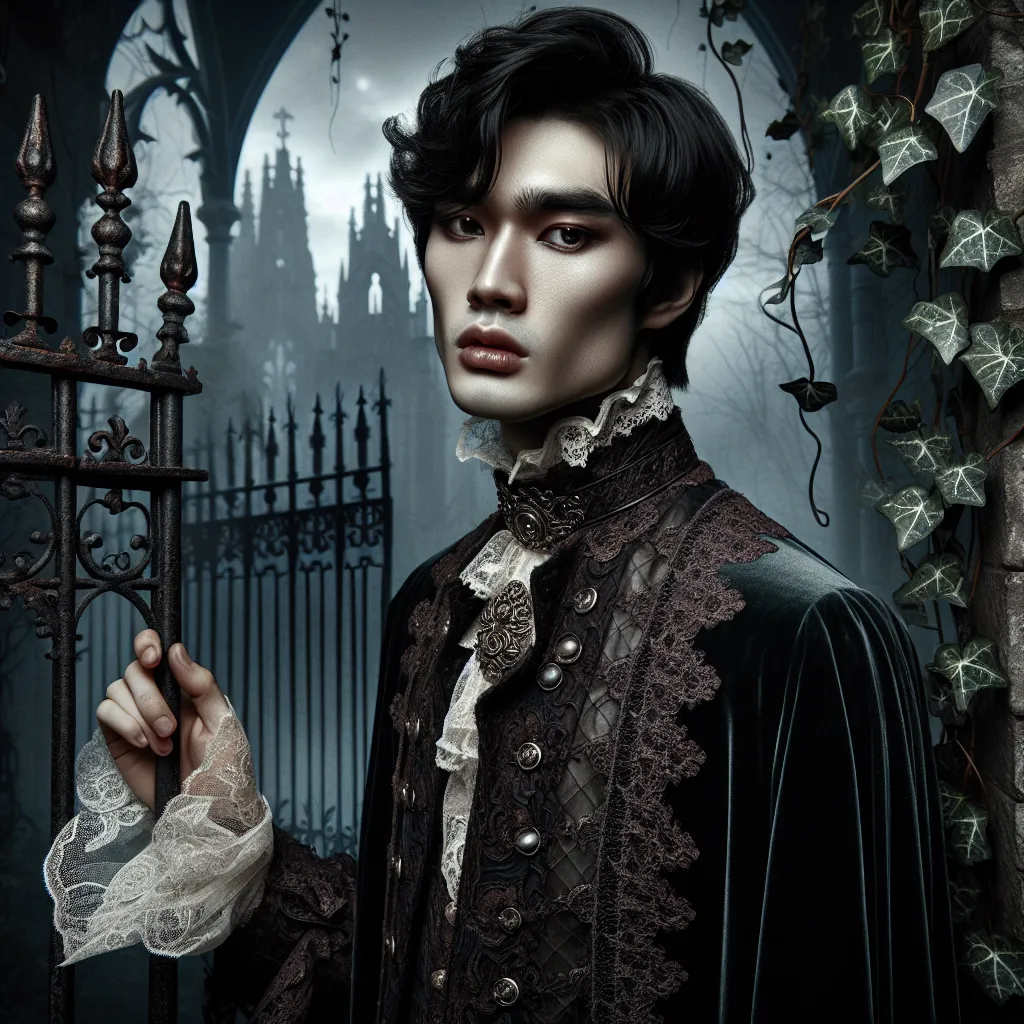 A young man in a Victorian-style vest and shirt stands beside an elaborate wrought-iron gate, surrounded by thick, curling ivy. His head is slightly turned, his pale features accentuated by a faint moonlit glow. In his hand, he holds a small, weathered leather book, and the faint silhouette of a Gothic cathedral looms in the misty background