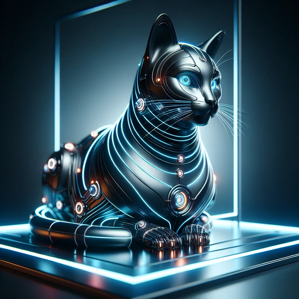 A sleek, futuristic cat with glowing lines along its body, sitting on a smooth, metallic platform