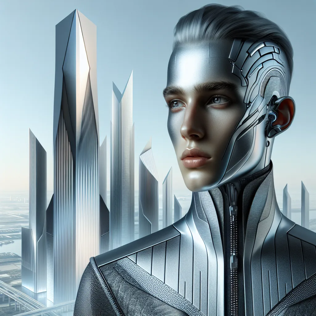 A minimalistic, futuristic skyscraper with sharp edges and a faintly glowing facade against a clear, soft blue sky