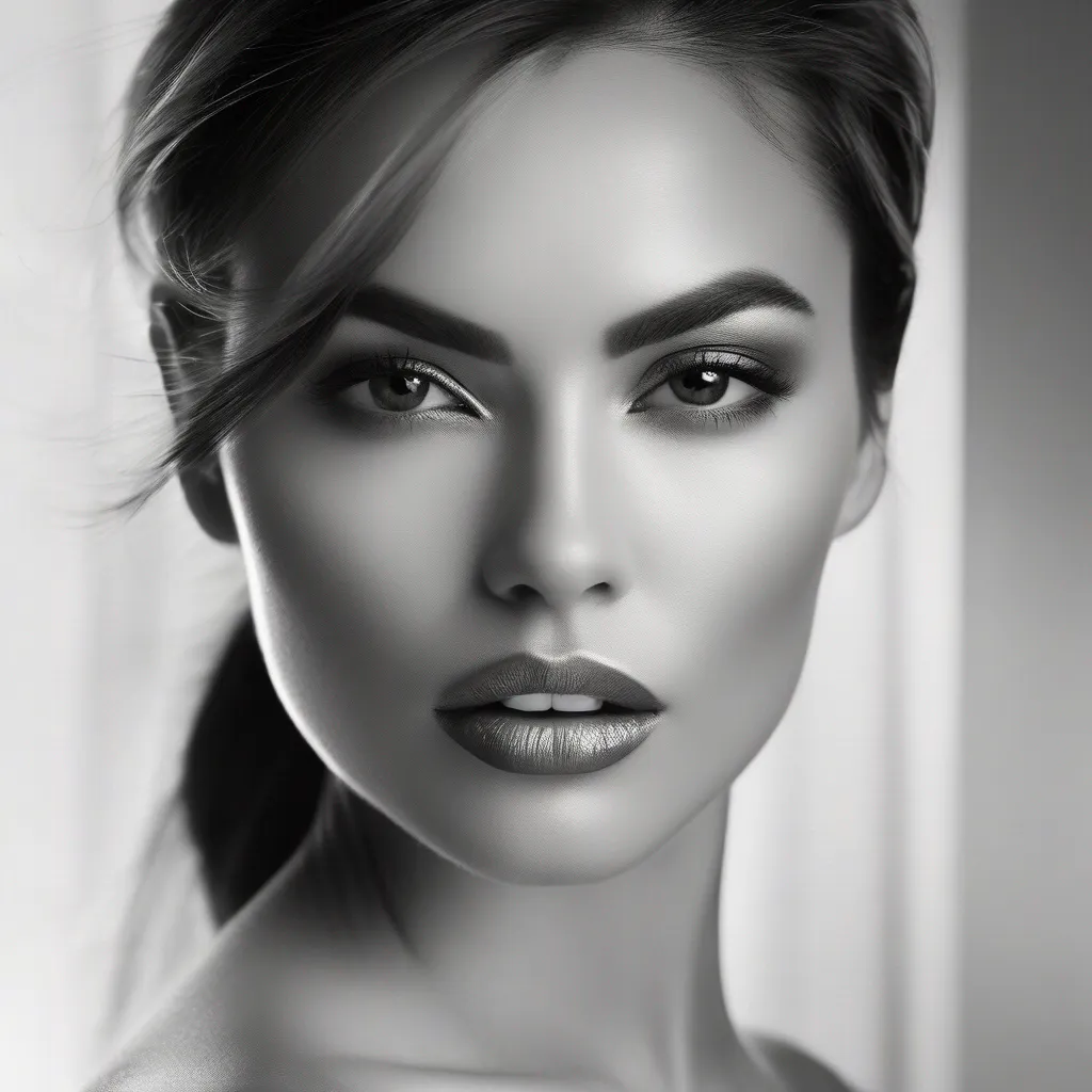 A striking close-up of a woman’s face, her lips brightly lit against shadowed cheekbones. Her hair is styled in sleek waves that catch faint highlights, while the dark background makes her features pop with intensity