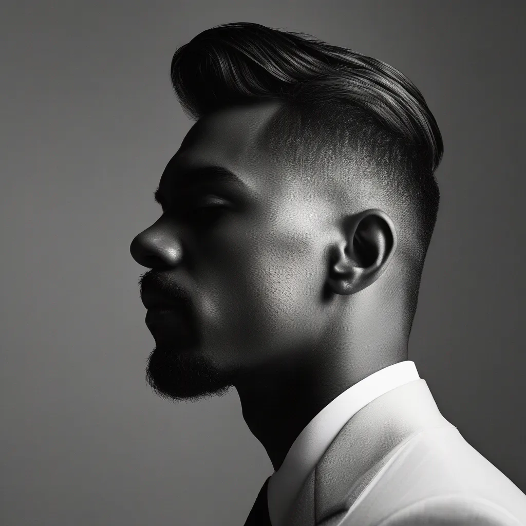 A clean, geometric portrait of a man’s profile, where sharp contrasts emphasize the contours of his face and the lines of his clothing