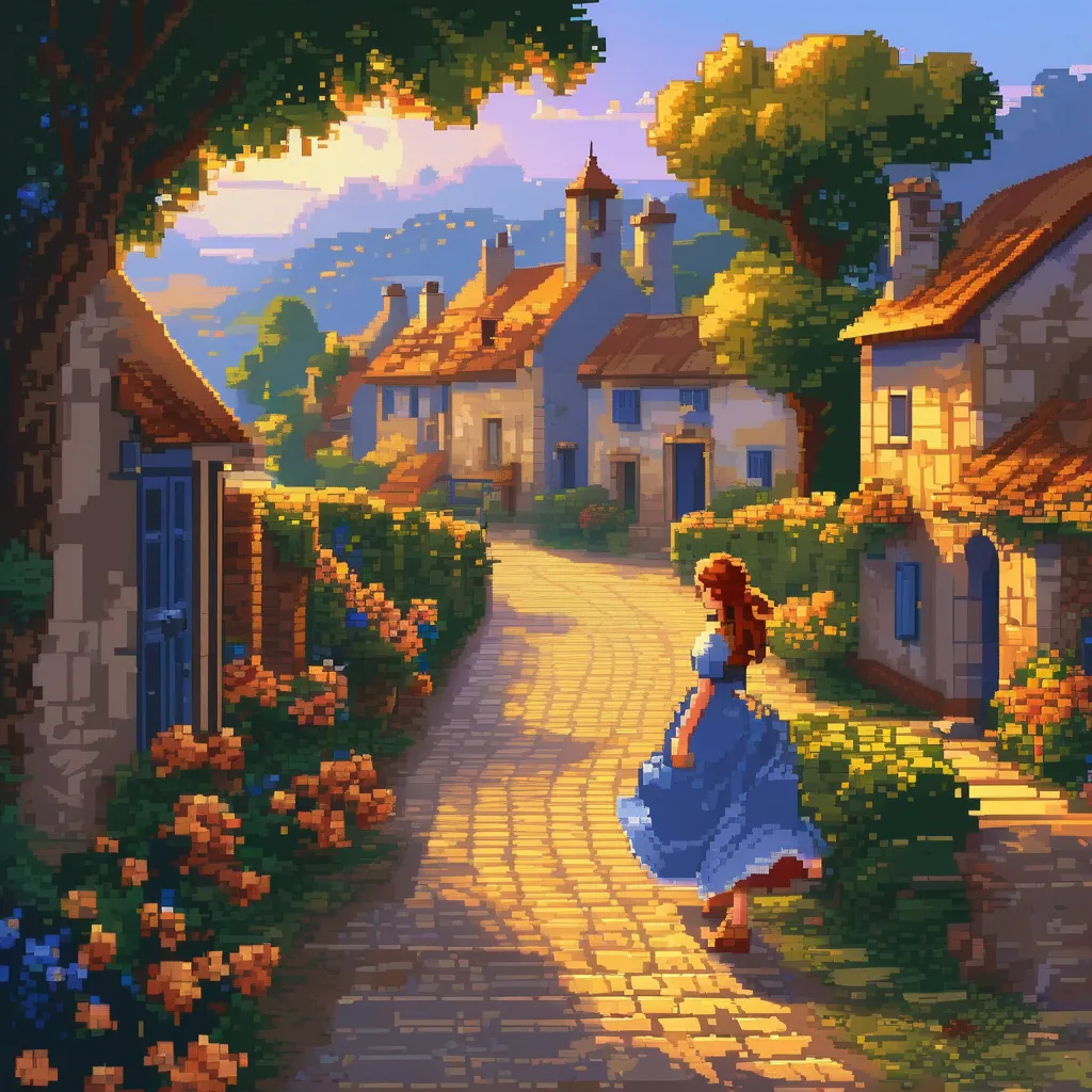 A young woman wearing a finely detailed blue dress, walking along a cobblestone path in a quiet village. Her dress flows gracefully as she moves, and the scene is illuminated by the golden hues of a setting sun, casting long shadows across the quaint, flower-filled square