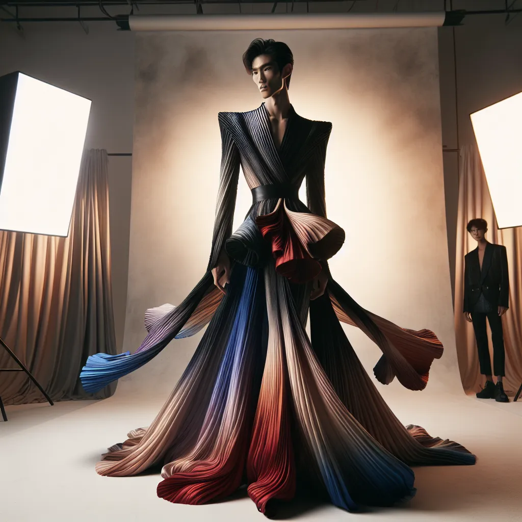 A tall, poised model standing under soft studio lighting, wearing a flowing, avant-garde gown in bold, contrasting colors. The backdrop features a subtle textured gradient, keeping the focus on the dress’s intricate folds and unique silhouette. Her pose is strong and confident, embodying high-end editorial style.