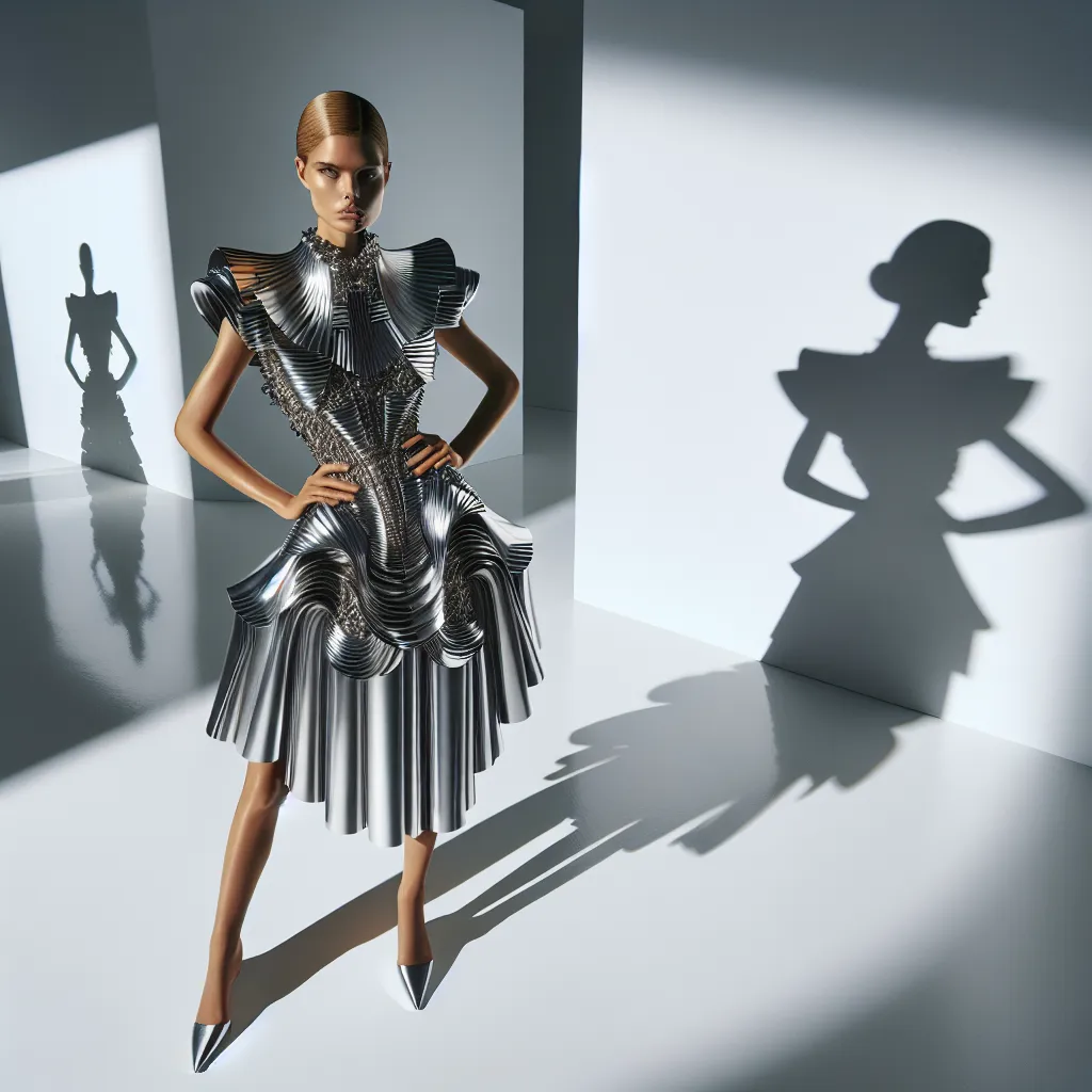 A dynamic editorial shot of a model wearing a futuristic, sculptural dress made of layered metallic fabrics. She stands in front of a clean, white backdrop, with dramatic lighting casting sharp shadows that highlight the dress’s intricate details. The look is bold and modern, perfect for a cutting-edge fashion magazine spread.