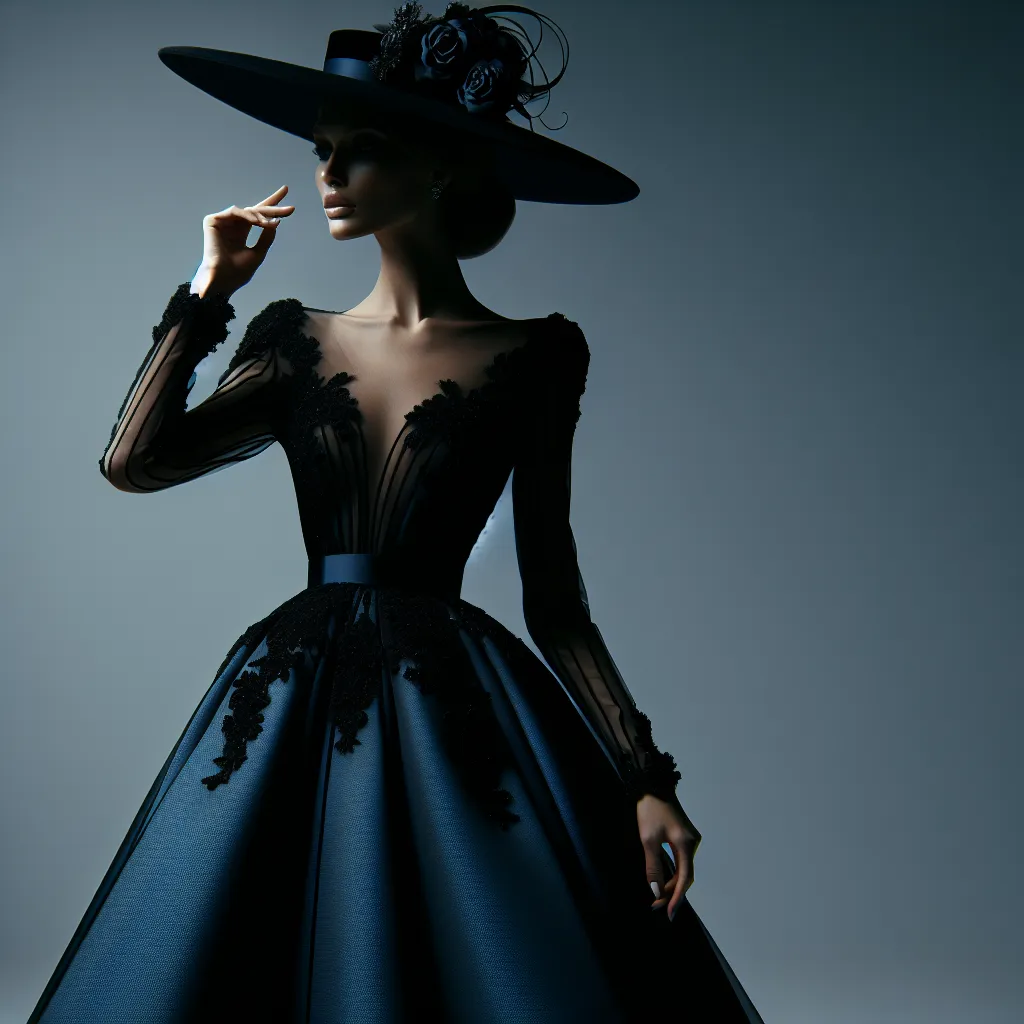 full body photography, a woman wearing an elegant blue black gown with elegant hat on her head