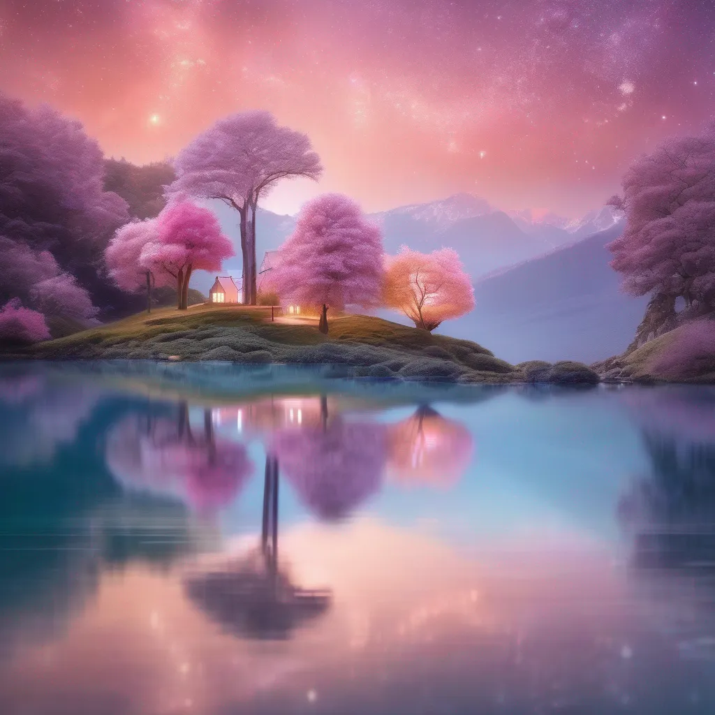 A surreal landscape with floating islands, glowing pastel-colored trees, and a shimmering lake reflecting a starry, twilight sky
