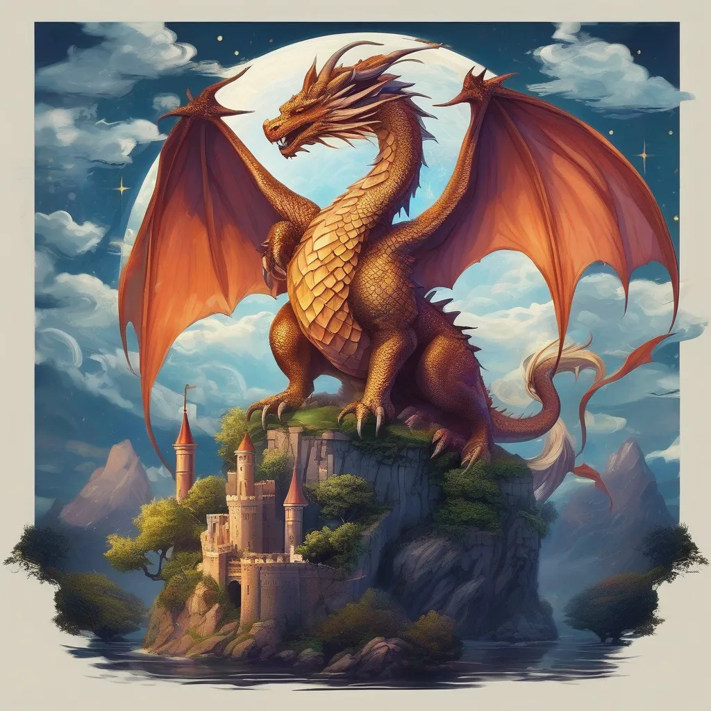 A majestic dragon perched atop a castle, surrounded by swirling clouds and a distant, glowing moon."